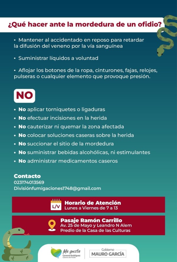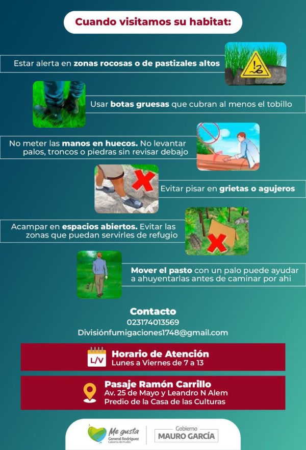 Actualmente, los antídotos específicos para estas especies se encuentran disponibles en el Hospital Posadas y en el Hospital Vicente López de General Rodríguez. Las autoridades recordaron que ante cualquier avistamiento o inquietud, los vecinos pueden contactar a la Dirección de Control de Plagas a través de la Casa de la Cultura (Pasaje Ramón Carillo, Av. 25 de Mayo y Leandro N. Alem) o las redes oficiales del municipio.