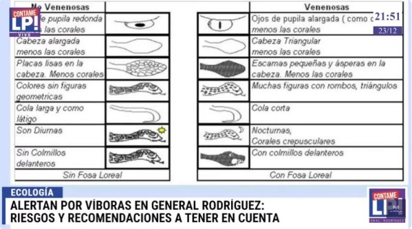 El riesgo principal en la zona pampeana es la Yarará, cuya cabeza triangular, escamas ásperas y pupilas elípticas la distinguen de las culebras inofensivas. Del Carre explicó una forma rápida de diferenciarlas mediante la observación de los ojos, comparándolos con los de un felino: "una víbora venenosa de una víbora no venenosa se diferencia muy fácilmente. En este caso las pupilas no tienen que ser elípticas. ¿Qué quiere decir? Aquellas que son elípticas, las que son como la de un felino, de un gato, esas sí son venenosas. Las que no son venenosas, que es la falsa yarará, son pupilas redondas".