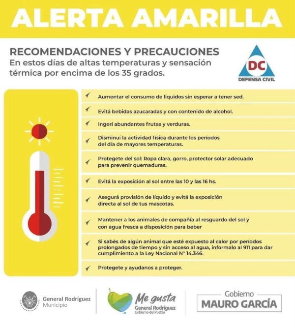 De acuerdo al alerta amarilla del SMN replicado por el Municipio de General Rodríguez a través de sus redes sociales, se prevén temperaturas extremas para la provincia de Buenos Aires, con vigencia por estas próximas 24 horas.