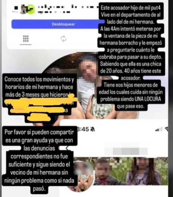 Aunque B. ya había elevado reclamos a la gerencia del edificio en el pasado, logrando un cese temporal de las molestias, las agresiones se reanudaron con mayor intensidad. Ante este panorama, la familia expresó su angustia y desesperación: "la denuncia está hecha pero él sigue acá en el departamento", señalaron, advirtiendo además que no sería la única afectada, ya que "hay otro caso de otra chica en el mismo edificio".