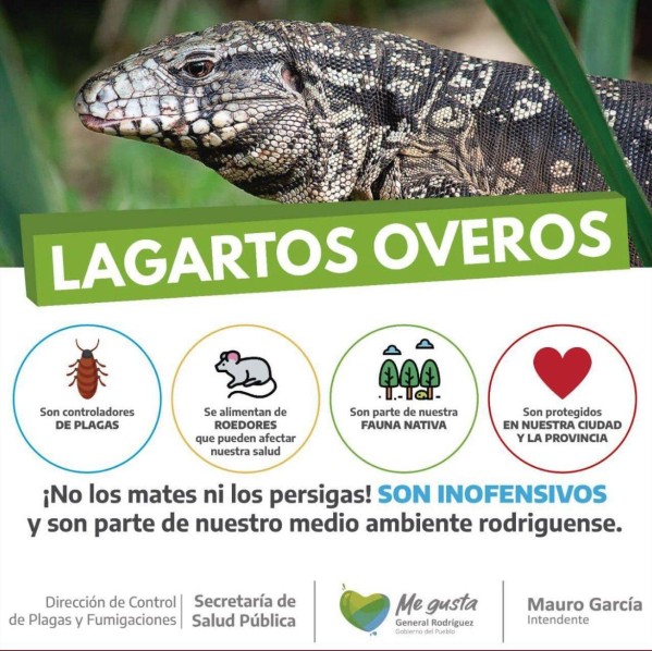 La Dirección de Control de Plagas y Fumigaciones de la Secretaría de Salud Pública del Municipio de General Rodríguez recuerda a la comunidad la importancia de respetar a los lagartos overos (Tupinambis merianae), especies nativas que forman parte de la fauna local.