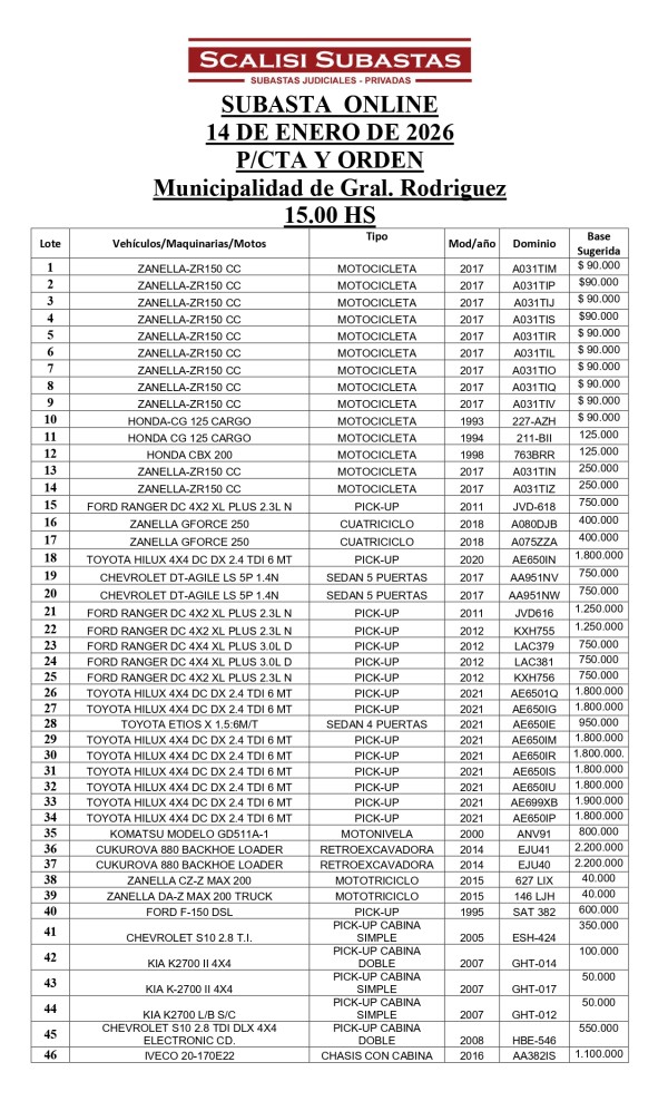 A continuación, el listado completo de los vehículos que se rematarán, detallando el tipo, marca, modelo, dominio y base sugerida: