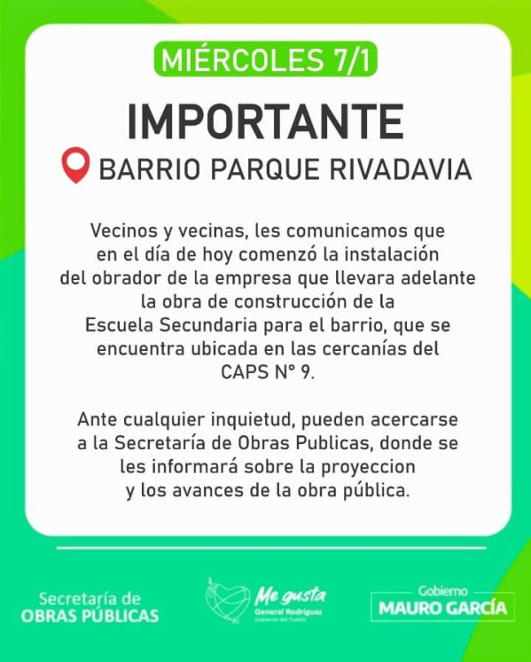 Desde la mencionada área del gobierno de Mauro García comunicaron a los residentes de Barrio Parque Rivadavia que este miércoles comenzó la instalación del obrador de la empresa a cargo de la construcción de la Escuela Secundaria, que estará emplazada en las inmediaciones del centro de salud local (CAPS N° 9).