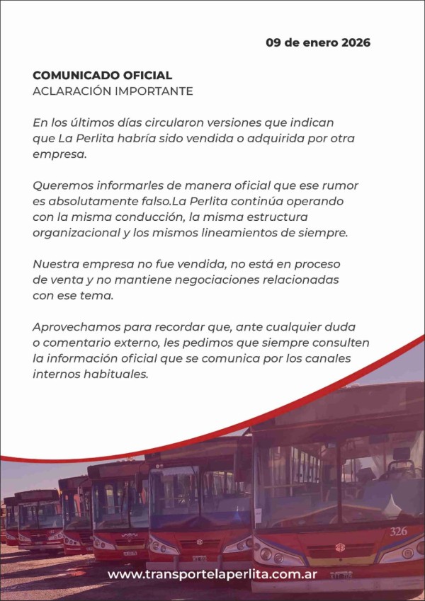 Tras la difusión de versiones que daban por concretada la compra de Transportes La Perlita por parte de Metropol y el Grupo Empresas Prieto, la compañía emitió un comunicado oficial para desmentir categóricamente los rumores. La firma calificó la noticia como "absolutamente falsa", asegurando que no se encuentra en proceso de venta ni mantiene negociaciones, manteniendo su conducción y estructura organizacional de siempre