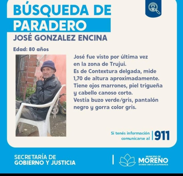 Se llama José González Encina, tiene 80 años, y es del barrio Santa Brígida de Moreno. Está desaparecido desde el pasado miércoles 17 de diciembre por la tarde, cuando salió de su domicilio y nunca más supieron de él. Sin embargo, su familia asegura tener el dato que fue visto por última vez por General Rodríguez, de modo que decidieron ampliar su búsqueda