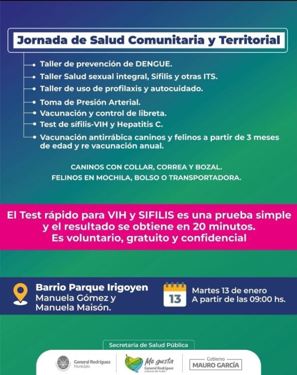 La Secretaría de Salud Pública de General Rodríguez confirmó la realización de una nueva Jornada de Salud Comunitaria y Territorial. El evento tendrá lugar este martes 13 de enero, a partir de las 09:00 horas, en la intersección de las calles Manuela Gómez y Manuela Maisón en el barrio Parque Irigoyen.