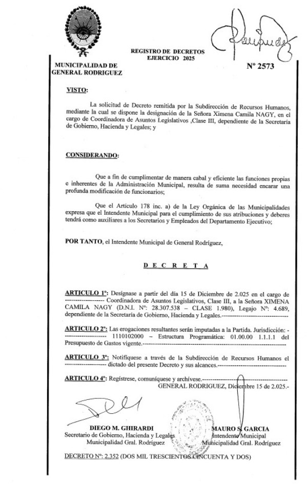 Un nuevo decreto firmado por el intendente Mauro García volvió a poner el foco sobre decisiones internas del Ejecutivo municipal que no pasan desapercibidas. Se trata del Decreto N.º 2573/2025, mediante el cual se designa a Camila Nagy en el cargo de Coordinadora de Asuntos Legislativos, Clase III, dependiente de la Secretaría de Gobierno, Hacienda y Legales, a partir del 15 de diciembre de 2025.
