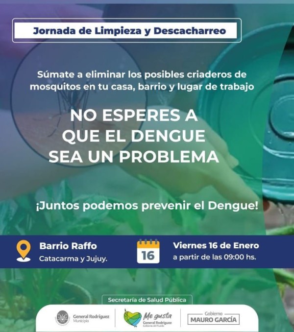 Bajo el lema “No esperes a que el dengue sea un problema”, la jornada busca generar conciencia sobre la importancia del descacharreo, una de las herramientas más efectivas para combatir la proliferación del mosquito Aedes aegypti, transmisor del dengue. La eliminación de recipientes que acumulen agua resulta clave para prevenir brotes de la enfermedad.