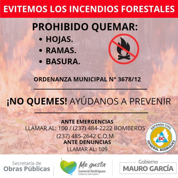 Ante el aumento del riesgo de incendios forestales, desde la Municipalidad de General Rodríguez reiteraron la prohibición de realizar quemas domiciliarias y al aire libre, una práctica que representa un grave peligro para el ambiente, la seguridad y la salud de la población.