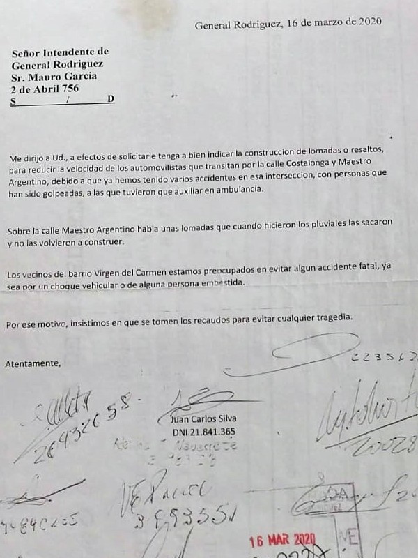 El 16 marzo de 2020, tras reunir firmas, los lugareños presentaron un expediente-petitorio dirigido al intendente Mauro García donde solicitaban “indicar la construcción de lomadas o resaltos para reducir la velocidad de los automovilistas que transitan por la calle Costalonga y Maestro Argentino, debido a que ya hemos tenido varios accidentes en esa intersección...”