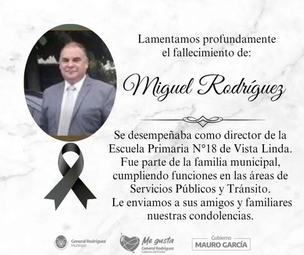La comunidad de General Rodríguez despide con tristeza a Miguel Rodríguez, director de la Escuela Primaria Nº 18 de Vista Linda y referente del área de Licencias de Conducir, quien dejó una huella imborrable tras más de tres décadas de servicio público y docencia. Falleció a la edad de 54 años, tras varios meses con problemas de salud