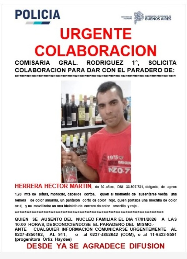 Hay una desesperada búsqueda de un vecino rodriguense domiciliado en el barrio Villa Vengochea, de quien no se tienen noticias desde hace más de 24 horas. Se trata de Héctor Martín Herrera, de 36 años, que fue a correr una carrera de bicicleta a Lobos, y debía estar de regreso en General Rodríguez en horas de la noche.