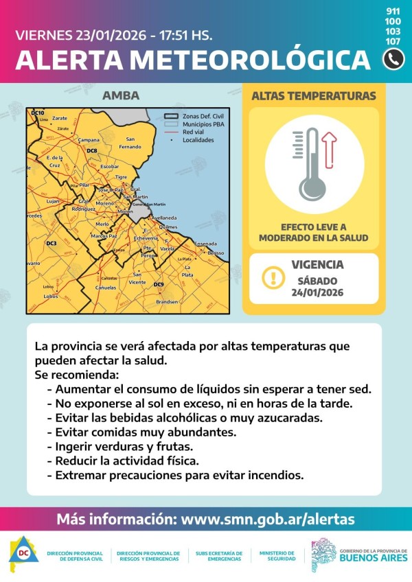El Servicio Meteorológico Nacional emitió una nueva alerta amarilla por altas temperaturas, con posible impacto en la salud, que estará vigente durante este sábado 24 hasta las 18 hs