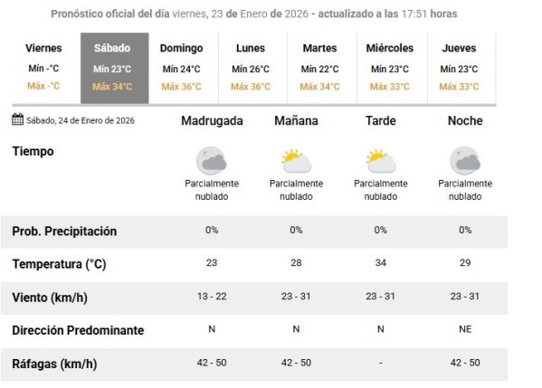 Según la página del Servicio Meteorológico Nacional, el cielo estará parcialmente nublado durante toda la jornada del sábado, con una temperatura que arrancará con 23ºC a la madrugada, irá subiendo a 28º por la mañana, y alcanzando su punto máximo de 34º por la tarde. En tanto que para la noche habrá un leve descenso hasta alcanzar los 29º.