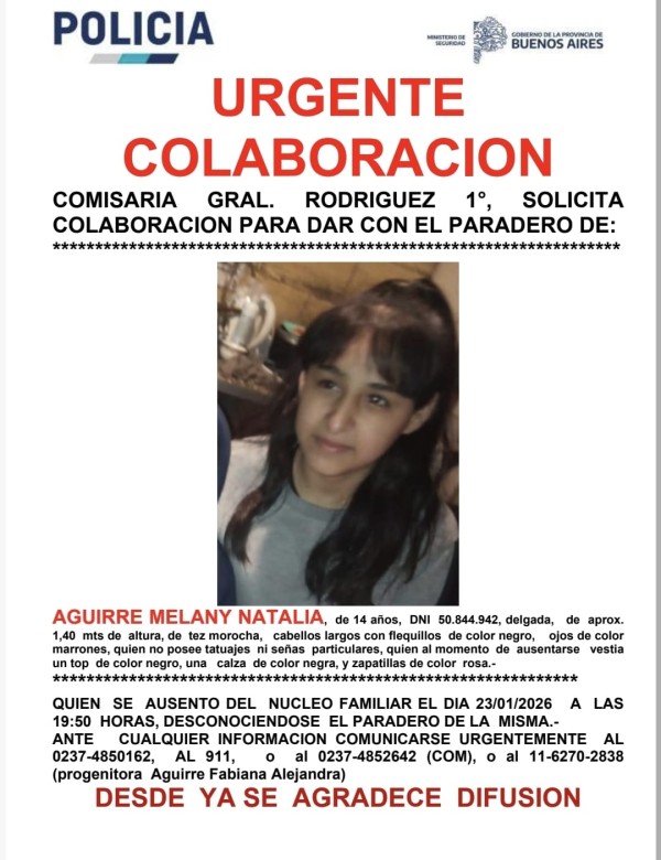Ante cualquier información, comunicarse urgentemente al 0237-4850162, al 911, al 0237-4852642 (COM), o bien al 11-6270-2838 (su madre Fabiana Alejandra Aguirre).