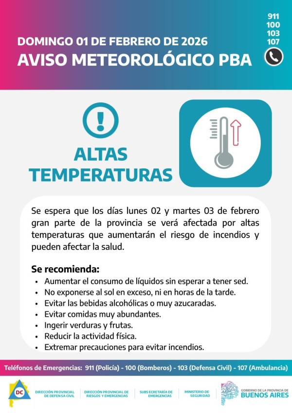 Luego de unos días de "calma" en cuanto al calor, con temperaturas bastante agradables y no sofocantes, vuelven las altas temperaturas a nuestra región según el aviso meteorológico emitido por la Dirección Provincial de Defensa Civil y replicado por el Municipio de General Rodríguez. Es que, siempre de acuerdo a lo informado, se esperan altas temperaturas en el Área Metropolitana de Buenos Aires (AMBA) como otras áreas de la Provincia, con riesgos para la salud y aumento del peligro de incendios. El alerta está vigente para este lunes 2 de febrero como martes 3.