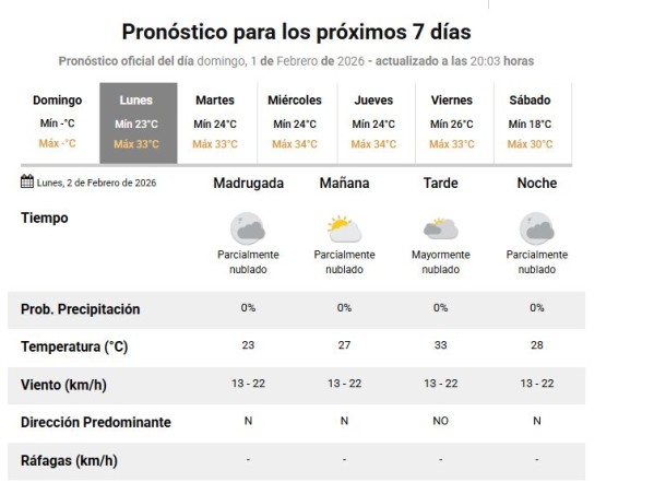 Siempre de acuerdo a la página oficial del Servicio Meteorológico Nacional, la jornada del lunes se avizora con un cielo de parcialmente a mayormente nublado durante todo el día. La temperatura arrancará con 23ºC por la madrugada, a la mañana llegará a los 27º grados, subiendo hasta los 33ºC por la tarde. En tanto que por la noche, la jornada culminará con 28º grados.