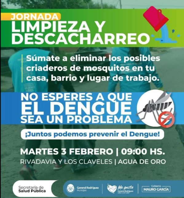 En el marco de las acciones preventivas contra el Dengue, la Secretaría de Salud Pública del Municipio anunció una nueva Jornada de Limpieza y Descacharreo que tendrá lugar este martes 3 de febrero a las 09:00 horas. El punto de encuentro y zona de inicio de las tareas será la intersección de las calles Rivadavia y Los Claveles, en el barrio Agua de Oro.