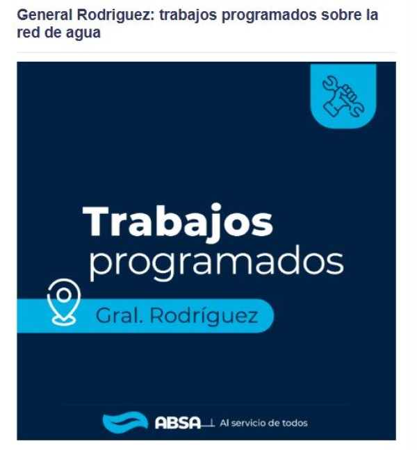 De acuerdo a lo anunciado por la empresa Aguas Bonaerenses Sociedad Anónima, este viernes podría generarse baja presión y/o posible falta de agua en la zona céntrica de General Rodríguez debido a que se harán tareas de mantenimiento en una cañería de la red de agua en la intersección de Avenida Presidente Peron e Intendente Manny.