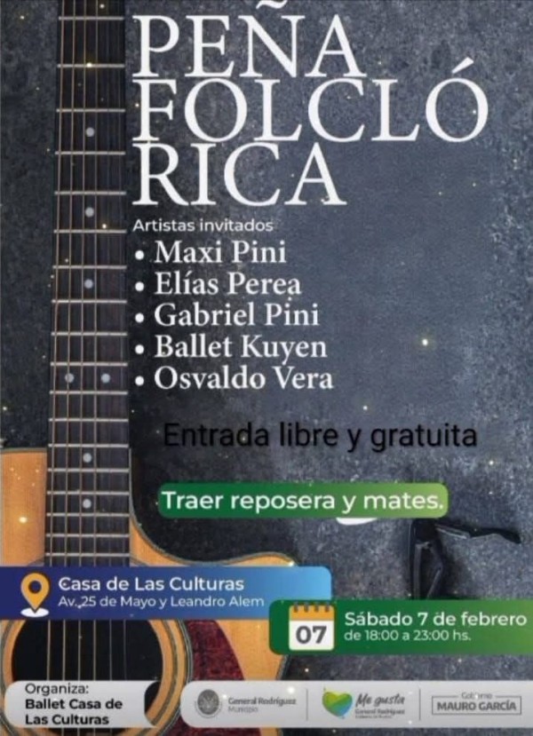 En la Casa de las Culturas, el próximo sábado 7 de febrero se realizará una Peña Folclórica, con la organización del Ballet Casa de las Culturas. Habrá varios artistas invitados y la entrada será libre y gratuita.