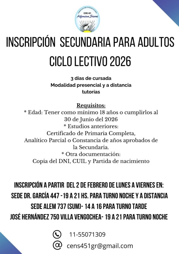 El CENS 451 Alfonsina Storni anunció la apertura de las inscripciones para la Secundaria de Adultos para el ciclo lectivo 2026. Esta propuesta educativa está diseñada para ofrecer flexibilidad a quienes buscan completar su formación, con una modalidad especial de cursada de tres días a la semana.