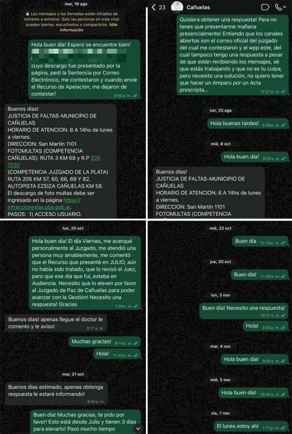 El desarrollo del caso muestra un derrotero de intentos fallidos por parte de la vecina para ejercer su defensa. El 9 de julio de 2025, C. realizó un descargo formal vía web y una posterior apelación que nunca recibió respuesta por parte de las autoridades de Cañuelas. La desesperación por la falta de canales oficiales la llevó a intentar comunicarse con el Juzgado de Faltas en 19 oportunidades entre agosto y noviembre de ese mismo año. En una de esas pocas ocasiones en las que logró hablar con un empleado, se le prometió una respuesta del juez que jamás llegó.