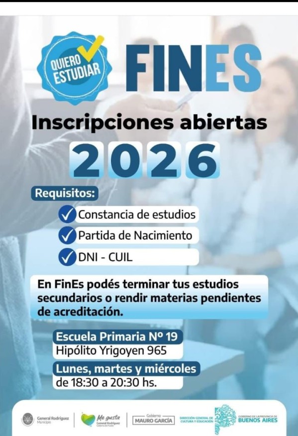 El programa FinEs abrió la inscripción 2026 para jóvenes y adultos que quieran finalizar sus estudios secundarios o acreditar materias adeudadas. En General Rodríguez funcionará en la Escuela Primaria N° 19, con cursada tres días por semana en horario vespertino.