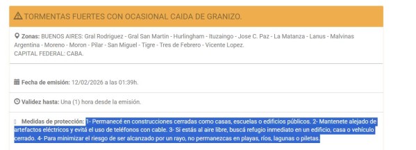 Según lo publicado por el Servicio Meteorológico Nacional en las últimas horas, se esperan tormentas aisladas pero fuertes con ocasional caída de granizo durante la madrugada en la región oeste y noroeste del AMBA, incluyendo a General Rodríguez entre los distritos afectados