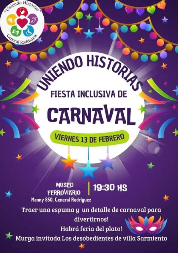 Hoy: Fiesta Inclusiva de Carnaval. La celebración comenzará este viernes 13 de febrero a las 19:30 horas, organizada bajo el lema "Uniendo Historias". El encuentro se llevará a cabo en las instalaciones del Museo Ferroviario, ubicado en Intendente Manny N° 850.