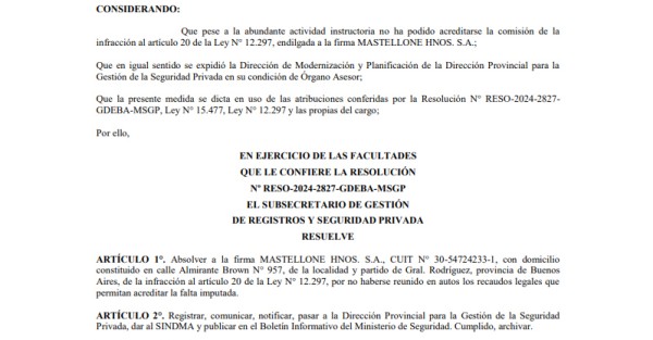 Este medio tuvo acceso a la decisión administrativa. En ese marco, en los considerandos, se indica textualmente “que pese a la abundante actividad instructoria no ha podido acreditarse la comisión de la infracción al artículo 20 de la Ley N° 12.297, endilgada a la firma MASTELLONE HNOS. S.A.; Que en igual sentido se expidió la Dirección de Modernización y Planificación de la Dirección Provincial para la Gestión de la Seguridad Privada en su condición de Órgano Asesor; Que la presente medida se dicta en uso de las atribuciones conferidas por la Resolución N° RESO-2024-2827-GDEBA-MSGP, Ley N° 15.477, Ley N° 12.297 y las propias del cargo”.