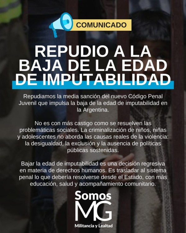 La agrupación Somos MG, encabezada por el intendente Mauro García, expresó su rechazo a la media sanción del nuevo Régimen Penal Juvenil que promueve, entre otras cuestiones, la reducción de la edad de imputabilidad en la Argentina.