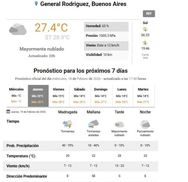 De acuerdo a lo informado por el Servicio Meteorológico Nacional, se espera una primera mitad del jueves complicada para el Área Metropolitana de Buenos Aires, incluyendo a General Rodríguez, con lluvias y tormentas aisladas