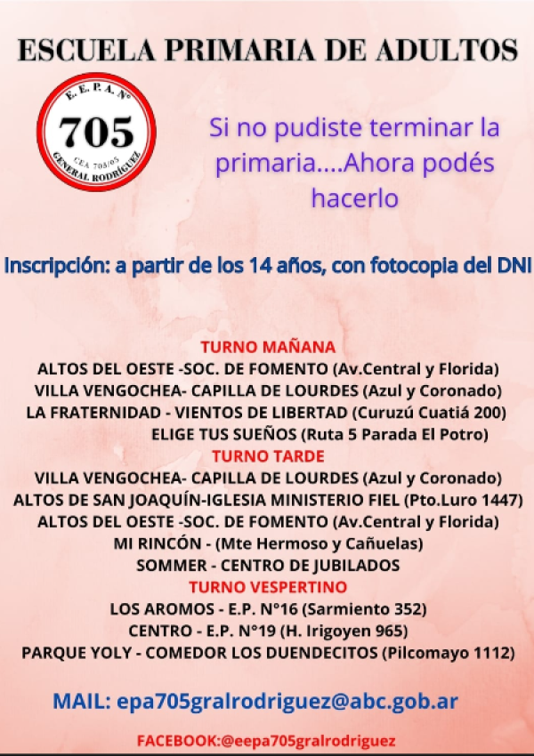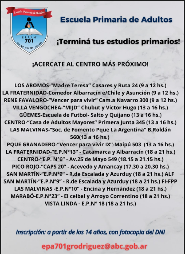 Las Escuelas Primarias de Adultos N° 701 y N° 705 (ubicada en la calle Sarmiento, entre Ecuador y Escuadrón Libertad, del barrio Los Aromos) han anunciado la apertura de inscripciones para el ciclo lectivo 2026, una propuesta diseñada para quienes, por diversos motivos, no pudieron completar sus estudios en el pasado o necesitan certificar esta etapa fundamental.