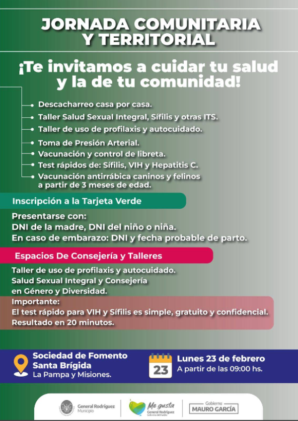 La Municipalidad de General Rodríguez anunció la realización de una nueva Jornada Comunitaria y Territorial. La actividad tendrá lugar en la Sociedad de Fomento Santa Brígida, ubicada en la intersección de las calles La Pampa y Misiones.