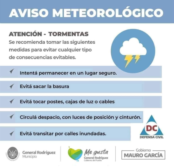 La Municipalidad de General Rodríguez, a través de la Dirección de Defensa Civil, replicó un aviso de alerta meteorológica ante la llegada de un frente de tormentas que afectará a nuestro distrito durante la tarde de este martes 24 de febrero.