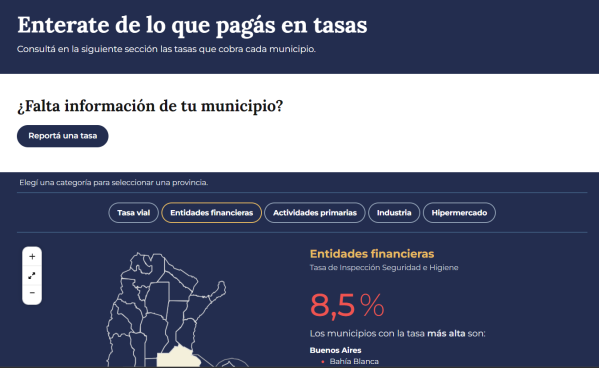 El sitio cuenta con una herramienta visual donde, al seleccionar la provincia de Buenos Aires, se despliega el listado de tasas que cobra cada comuna. En el caso de nuestro distrito, el sistema permite contrastar y denunciar cobros divididos en categorías como:
