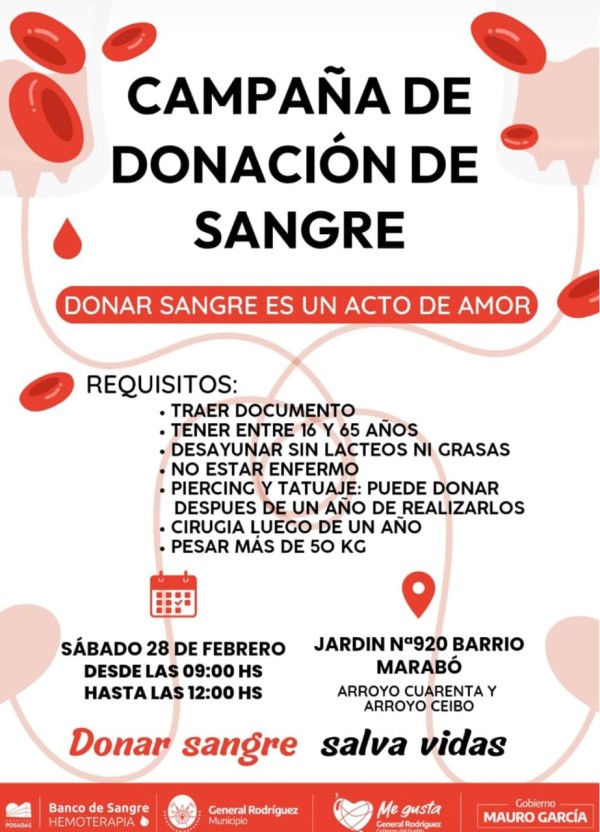 Por temas logísticos del Posadas, la jornada del jueves 12 se pasó para este sábado. La comunidad de General Rodríguez se prepara para una nueva muestra de compromiso y solidaridad. Bajo el lema "Donar sangre es un acto de amor", el Banco de Sangre-Hemoterapia del Hospital Posadas -con la participación del Municipio- ha organizado una jornada especial de donación en el Barrio Marabó. El objetivo principal es apoyar el tratamiento de Luis Fernando Mamani, un joven de 17 años vecino del barrio, quien debido a su patología requiere de transfusiones constantes para asegurar su bienestar.