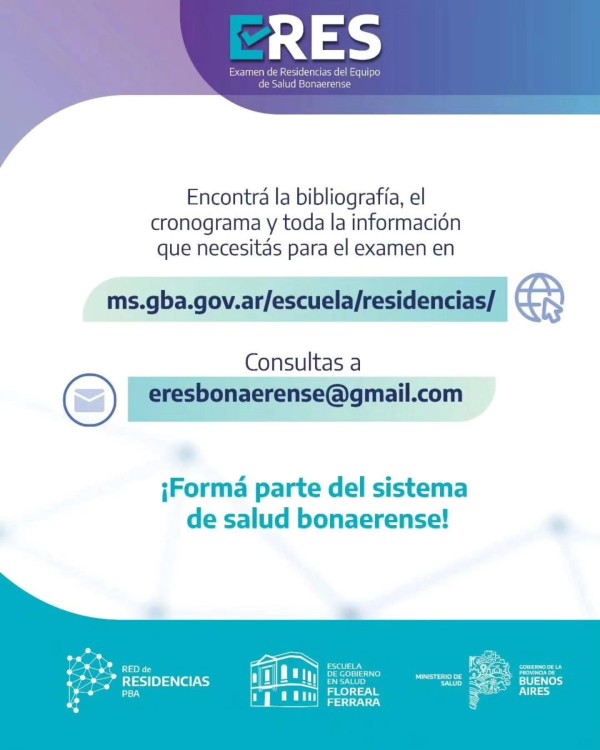 Para consultas generales, los postulantes pueden escribir a [email protected] o dirigirse al Departamento de Residencias en la Escuela de Gobierno en Salud “Floreal Ferrara”, situada en la calle 4 N° 962 esquina 51, La Plata.
