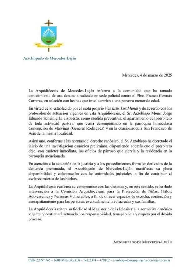 Tras la detención del cura Franco Germán Carreras por graves denuncias de abuso sexual contra dos personas, el Arzobispado de Mercedes-Luján ordenó su apartamiento inmediato de toda función pastoral y el inicio de una investigación canónica interna