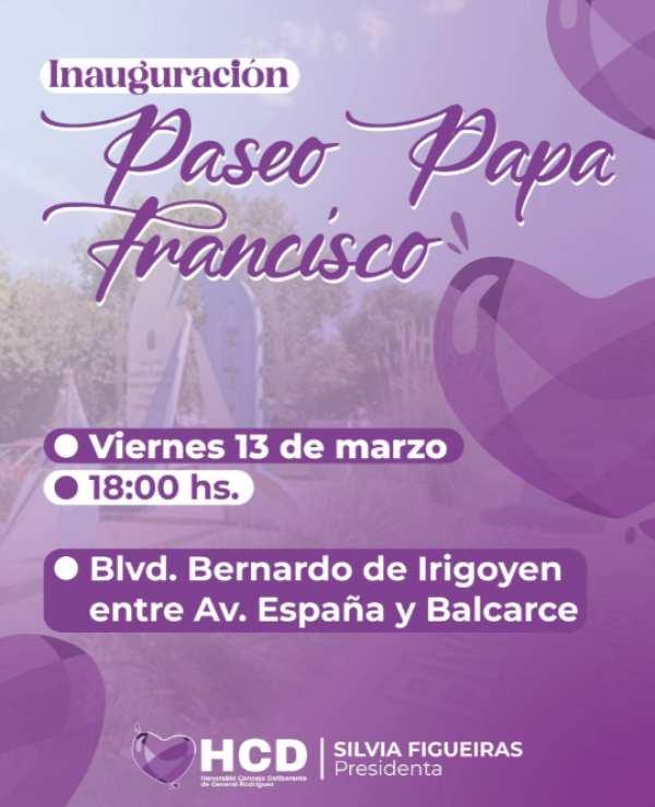Este viernes 13 de marzo, se llevará a cabo la inauguración oficial del "Paseo Papa Francisco", una iniciativa impulsada desde el Honorable Concejo Deliberante (HCD) local.