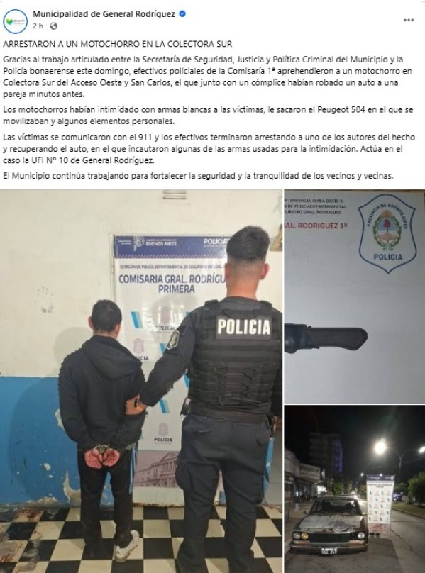 Tras el hecho, la Municipalidad de Gral. Rodríguez difundió un comunicado titulado “Arrestaron a un motochorro en la Colectora Sur”, donde se relata la secuencia del mismo episodio pero presentada de forma distinta a lo manifestado por la víctima.