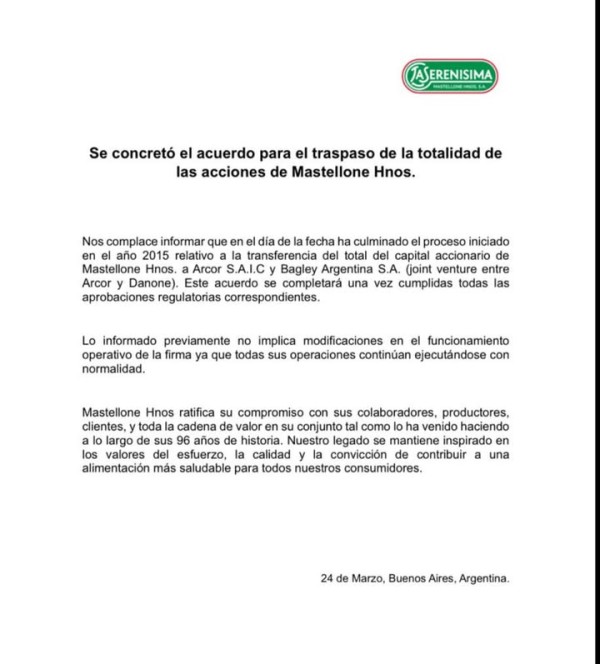 Llegar a este acuerdo no fue una tarea sencilla. El proceso se inició a mediados de abril del año pasado, cuando Arcor y Danone presentaron una oferta para ejecutar su opción de compra por la mayoría accionaria. Durante meses, los entonces dueños mayoritarios (especialmente Carlos Agote, quien actuó como arquitecto financiero y vocero de la familia fundadora) rechazaron las condiciones, calificando la propuesta de "insuficiente" y "hostil".
