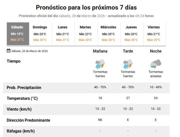 Siempre de acuerdo a lo informado en el sitio del SMN, las tormentas pasarán de fuertes a aisladas durante la noche de este sábado, con un 10-40 por ciento de probabilidades con el correr de las horas del día. La temperatura alcanzará su pico máximo con 27º por la tarde, habiendo un leve descenso de temperatura a 24º para la noche.