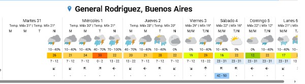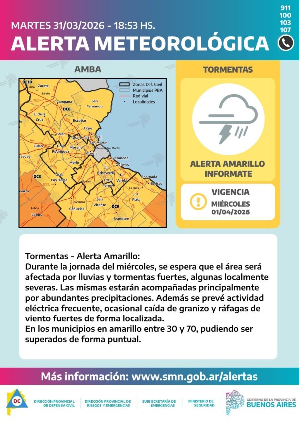 De acuerdo al informe de la Municipalidad (a través de la Dirección Provincia de Defensa Civil, Dirección Provincial de Riesgos y Emergencias, Subsecretaría de Emergencias, Ministerio de Seguridad y Gobierno de la Provincia de Buenos Aires) y replicando el alerta emitido por el SMN, “se espera que el área será afectada por lluvias y tormentas fuertes, algunas localmente severas. Las mismas estarán acompañadas principalmente por abundantes precipitaciones”.