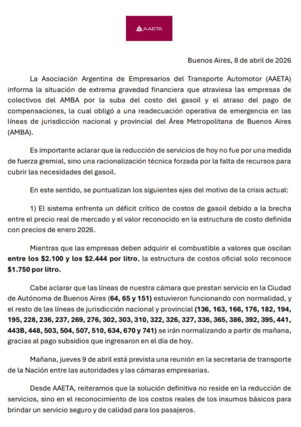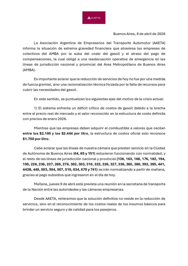 "La Asociación Argentina de Empresarios del Transporte Automotor (AAETA) informa la situación de extrema gravedad financiera que atraviesa las empresas de colectivos del AMBA por la suba del costo del gasoil y el atraso del pago de compensaciones, la cual obligó a una readecuación operativa de emergencia en las líneas de jurisdicción nacional y provincial del Área Metropolitana de Buenos Aires (AMBA).