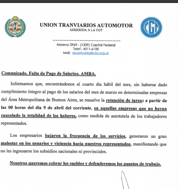 Según el comunicado oficial emitido por el gremio, la medida se debe al incumplimiento del pago íntegro de los salarios correspondientes al mes de marzo. La UTA señaló que, al encontrarse ya en el cuarto día hábil del mes sin haber recibido la totalidad de los haberes, los trabajadores iniciarán la protesta a partir de la medianoche. Esto implica que habrá una menor circulación de colectivos a partir de la medianoche.