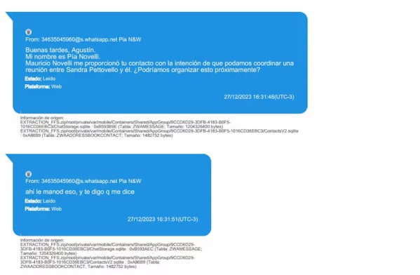 La secuencia comienza el 27 de diciembre de 2023 a las 16.31, cuando Pía Novelli -hermana y asistente del empresario- le escribe a Rossi: “Mauricio Novelli me proporcionó tu contacto con la intención de que podamos coordinar una reunión entre Sandra Pettovello y él. ¿Podríamos organizar esto próximamente?”. El secretario respondió: “Ahí le mando eso, y te digo q me dice”.