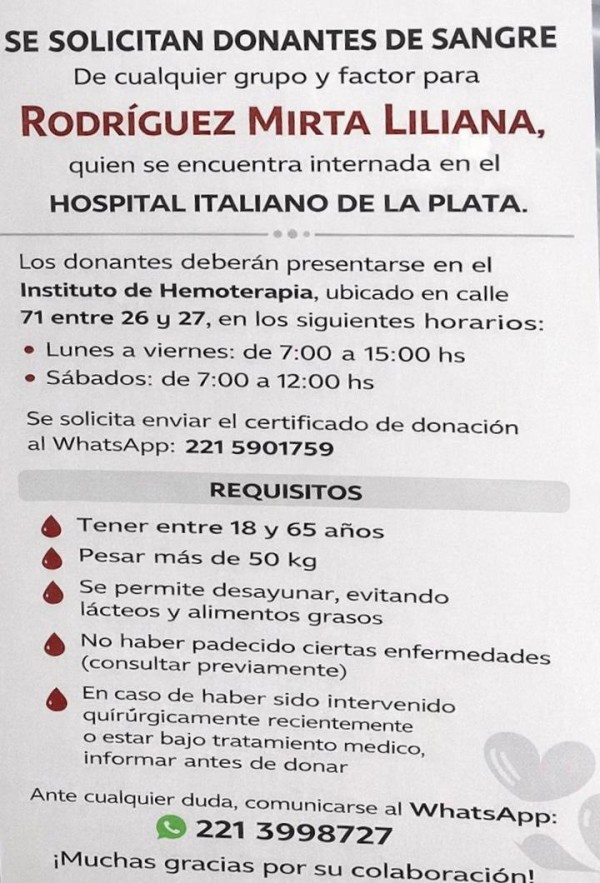Se lanzó un pedido urgente de donantes de sangre para Mirta Liliana Rodríguez, vecina de General Rodríguez y ex trabajadora municipal, quien fue sometida a una intervención quirúrgica cardíaca y se encuentra internada en el Hospital Italiano de la ciudad de La Plata.