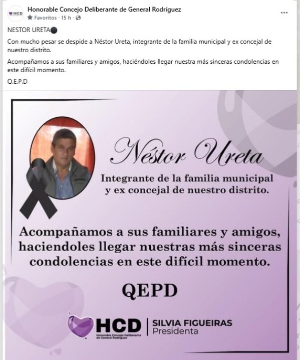 En la misma línea, el Honorable Concejo Deliberante (HCD) manifestó: “Con mucho pesar despedimos a Néstor Ureta, acompañando a sus familiares y amigos en este difícil momento”.