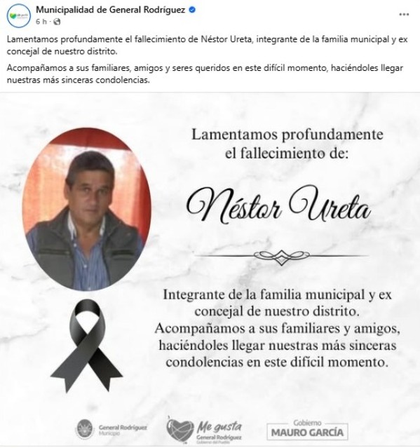 Tras conocerse su fallecimiento, desde la Municipalidad de Gral. Rodríguez expresaron: “Lamentamos profundamente el fallecimiento de Néstor Ureta, integrante de la familia municipal y ex concejal de nuestro distrito”.